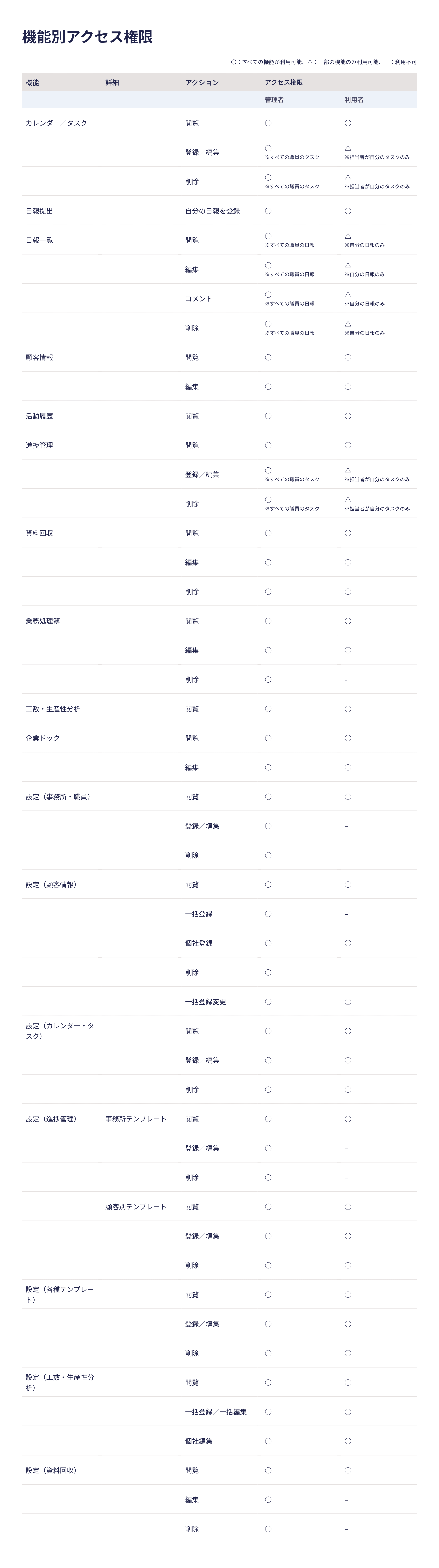 ライセンスの種類や権限について教えてください2025年8月26日 更新Q. ライセンスの種類や権限について教えてください。 ZEXTのライセンスには『管理者』と『利用者』の2種類があり、それぞれ機能別のアクセス権限が異なります。 権限管理について 権限は弥生マイポータル上で管理されており、ZEXT画面では反映のみ行われます。設定変更は「マイポータル > 事業者管理 > 操作権限変更」から行ってください。