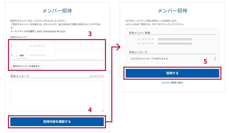 ※「招待するメンバーを追加する」をクリックすると、招待する従業員の入力を増やすことができます(最大10名まで)。 - 「招待内容を確認する」ボタンをクリックする