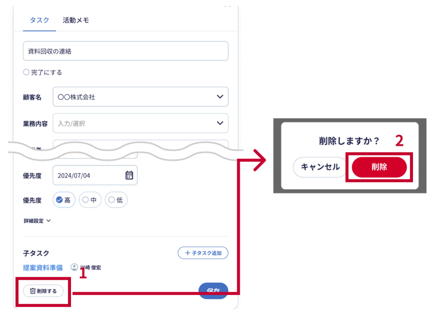 - 子タスクがある場合:子タスクも同時に削除されます。