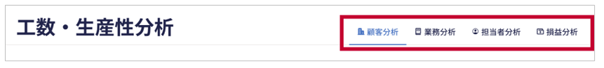 - タブ切り替え:画面上部のタブ(顧客分析/業務分析/担当者分析/損益分析)をクリックして切り替えます